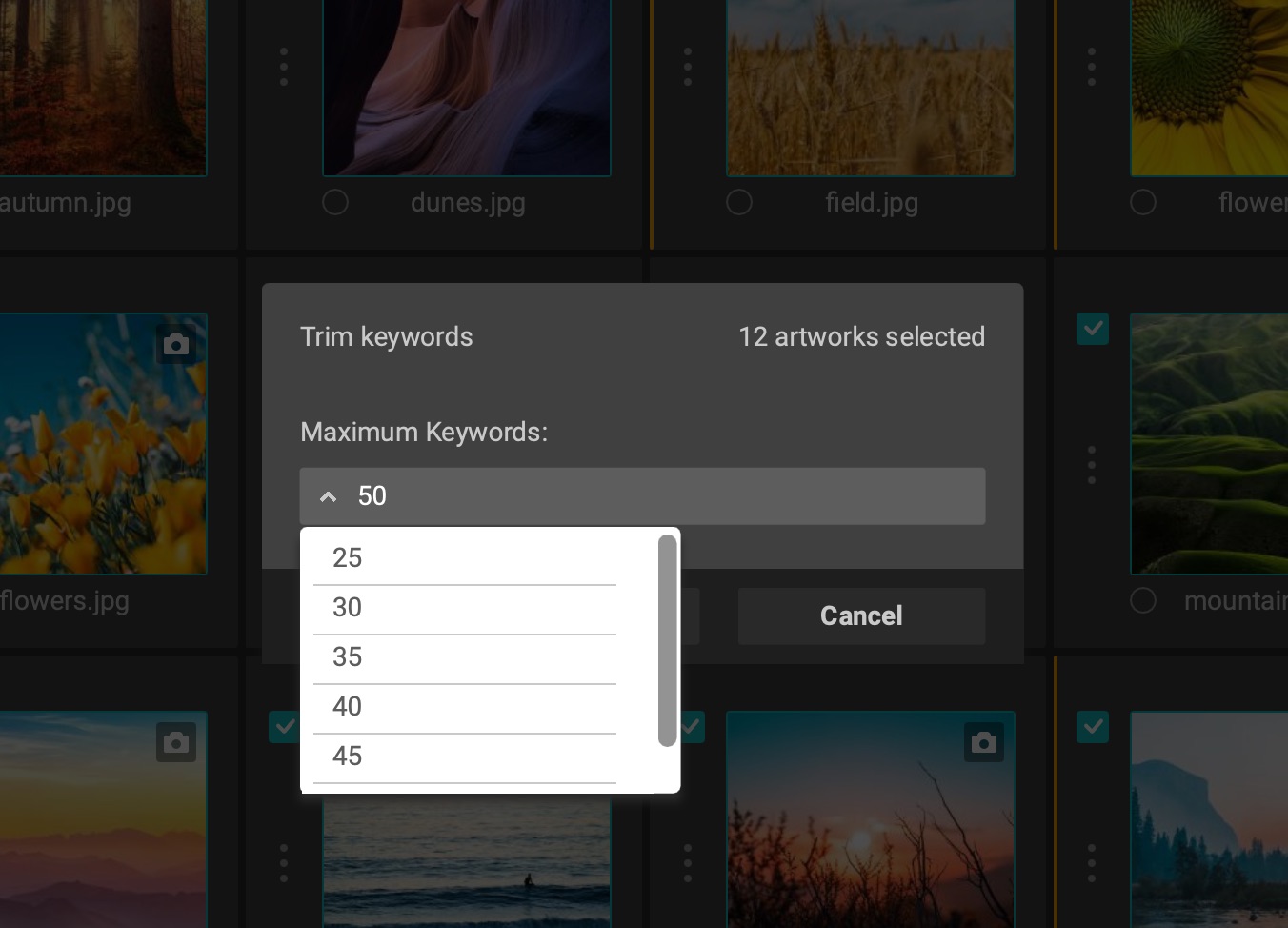 - trimming keywords with a specified number (e.g. “have 40 keywords maximum” for all artworks)