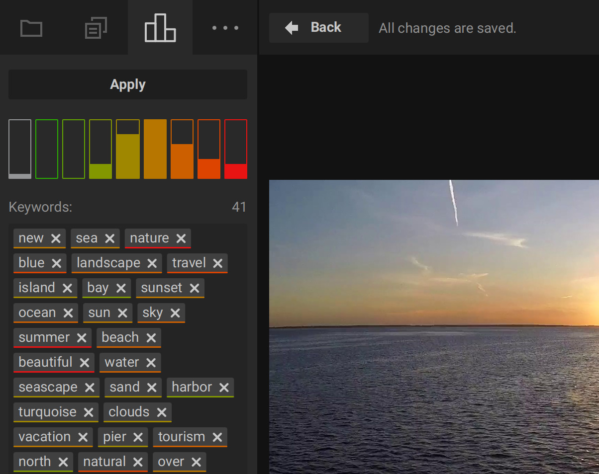 In addition to each keyword color, there’s a distribution shown so that you can understand your keywording in total.