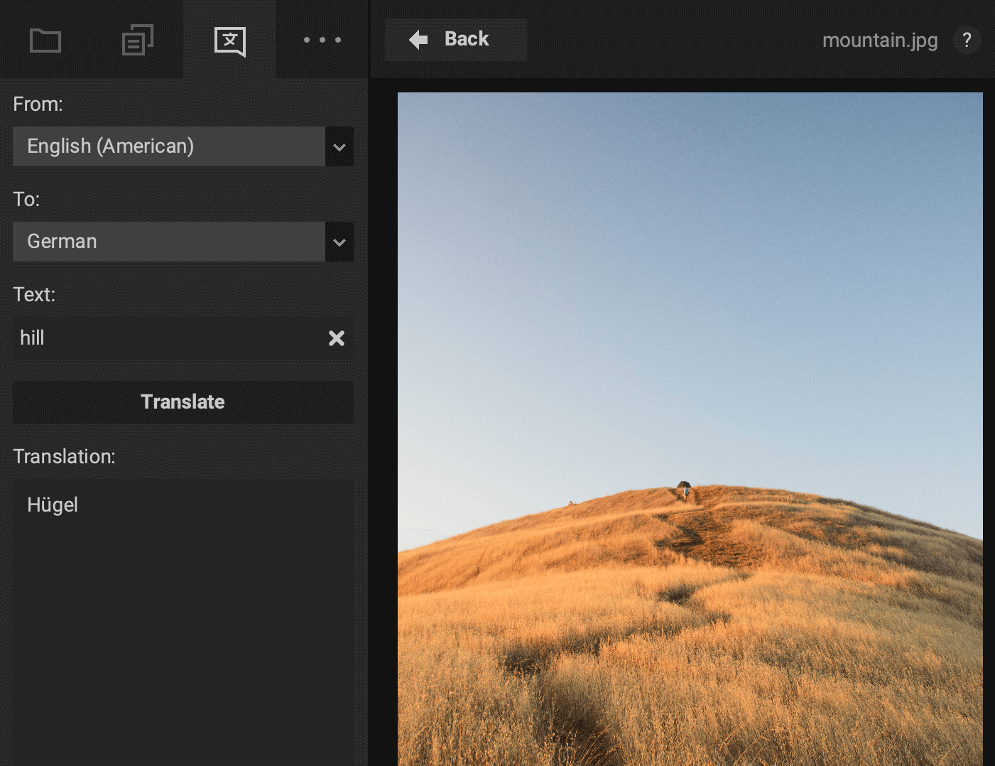 Plugin supports translation to and from 26 different languages: Bulgarian, Czech, Danish, German, Greek, English (UK and US), Spanish, Estonian, Finnish, French, Hungarian, Italian, Japanese, Lithuanian, Latvian, Dutch, Polish, Portutuese (Brazil and EU), Romanian, Russian, Slovak, Slovenian, Swedish, Chinese. Translation rate limits apply.